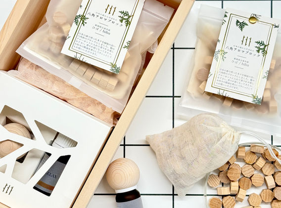 アロマウッドキャップと八角アロマブロックが入ったギフトボックスです。ご自宅用はもちろん、新築祝いやご結婚祝いなど新生活を始められる方へのギフトとして最適です。